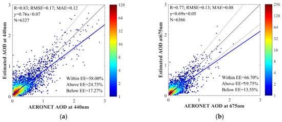The scatterplots of the DNN estimated (a) 440 nm and (b) 675 nm AOD results against the corresponding AERONET AODs using the leave-one-station-out cross-validation.