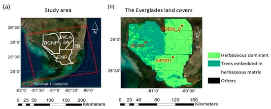 (a) Map of the study area in the Everglades according to the extent of EDEN water surface products, including four hydrological units (polygons with white boundaries). The red frame shows a Sentinel-1 SAR footprint. (b) The land cover map of the Everglades is derived from the South Florida Water Management District (SFWMD) Land Cover Use map for 2014–2016 (https://geo-sfwmd.hub.arcgis.com/datasets/sfwmd::sfwmd-land-cover-land-use-2014-2016/about, last accessed on 1 November 2021, with details provided in Supplementary Material Note 1). Red dots mark the locations of three selected EDEN water gauges presented in Section 5.1. (Background of both maps is the optical base map provided by ESRI, DigitalGlobe, GeoEye, Earthstar Geographics, CNES/Airbus DS, USDA, USGS, AeroGRID, IGN, and the GIS User Community).