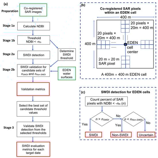 (a) Flow chart of the three-stage Significant Water-Depth Increase (SWDI) detection and validation algorithm. Rectangles with a green boundary represent data; rectangles with a black boundary represent analyses; rectangles with a red boundary represent products and results. (b) Illustration of 20 × 20 co-registered SAR pixels within an EDEN cell. (c) Decision tree of SWDI detection for EDEN cells based on Normalized Difference Backscatter Index (NDBI) values of SAR pixels. Diamonds denote criteria for n, i.e., the percentage of SAR pixels with NDBI < −nth.