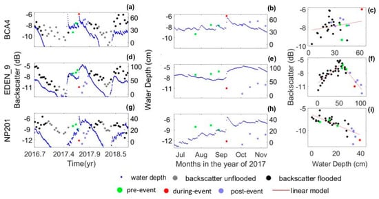 Backscatter changes in response to variations in water depths for three selected water gauges. Three rows represent water gauges ‘BCA4’, ‘EDEN_9’, and ‘NP201’, respectively. (a,d,g) Temporal changes in backscatter and water depths from September 2016 to September 2018. Small blue dots represent daily water depth; black and grey dots represent SAR backscatter values under flooded and unflooded conditions, respectively; green, red, and purple dots represent pre-, during-, and post-event backscatter, respectively. The x-axes represent time in decimal year format. Water depth measurements under unflooded conditions (negative values) were excluded. (b,e,h) Zoomed-in view for the period from July to November 2017, highlighting pre-, during-, and post-event data. (c,f,i) Scatter plots of backscatter and water depth under flooded conditions from September 2016 to September 2018 with red lines representing least-squares best-fitting models.