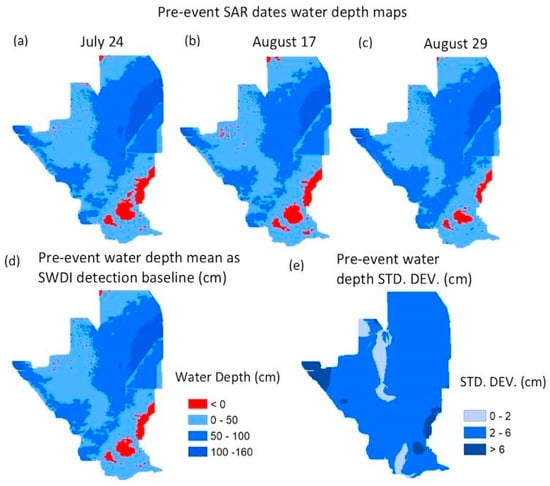 (a–c) Pre-event water-depth maps for the three selected SAR dates in 2017. Negative water depths (red areas) represent unflooded conditions, and positive water depths (blue areas) represent flooded conditions. (d) Pre-event water-depth mean map as the baseline for SWDI detection. (e) Pre-event water-depth standard deviation map, with each pixel representing the standard deviation of three water-depth values for the pre-event SAR dates. Most study areas show standard deviations between 2 and 6 cm, and the spatial mean value of standard deviations is 4 cm.