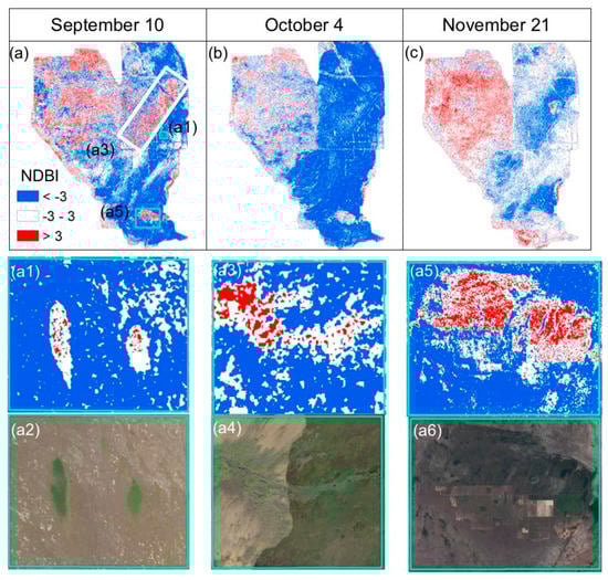 (a) NDBI map for the during-event (10 September) SAR acquisition with three cyan frames denoting local areas with a contrast NDBI pattern and a white frame denoting the boundary area between WCA-3A and 3B. (b,c) NDBI map for post-event SAR dates October 4 and November 21, respectively. (a1–a6) Zoomed-in views of three exemplary areas with (a1,a3,a5) displaying classified NDBI values and (a2,a4,a6) displaying the corresponding optical images. The figures are similar to the results reported in our previous study [57].