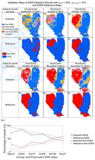 (a–l) Validation maps for SWDI detection and corresponding reference maps for the six target dates. The white polygon in (a) represents boundary areas between WCA-3A and 3B with a mix of true and false classifications. (m) Time series of pixel percentages of the classified and reference SWDI and non-SWDI classes.