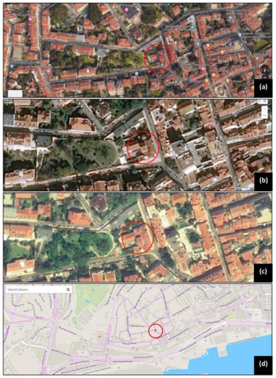 Evaluation of the façade images for assessing the conservation state by using different web platforms: (a) Google Maps, (b) Bing Maps, (c) OpenStreetCam, and (d) Mapillary.