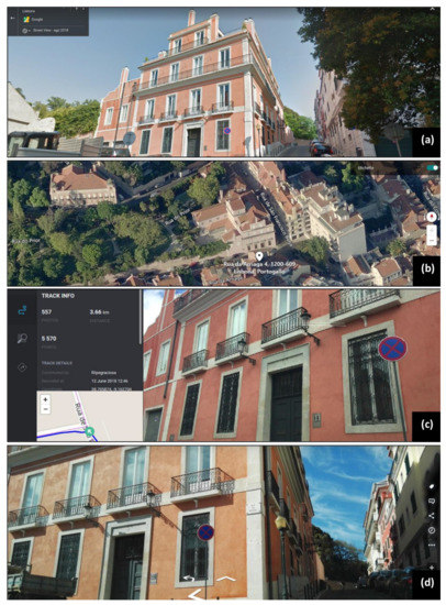 The first step towards this objective consists of the selection of suitable web tools, among those that offer detailed road-level imagery. This first criterion led to discarding some less popular web-mapping platforms, such as “HERE WeGo” [21], a mapping and geographic data processing service by the German company here. Conversely, some less popular platforms emerged due to this criterium, namely a few crowdsourcing-based platforms whose principle seems to be promising within the scope of the present investigation. After a detailed analysis of all the web mapping platforms available online, five platforms appeared as main possibilities: Google Maps [22] & Google Earth [23] (by Google), Bing Maps [24] (Microsoft), Mapillary [25] (Mapillary AB), OpenStreetCam–currently KartaView [26] (KartaView), and Yandex.Maps [27] (Yandex). The most relevant strengths and shortcomings of each of these platforms, given the scope and objectives of this research, are summarized in Table 2. The five web-based mapping platforms included in Table 2 were tested for acquiring data from a real building located in the city of Lisbon (Portugal). The objective was to investigate if the imagery and the tools offered by each one of these services were suitable to provide a detailed and accurate description of the buildings of interest so that they can be used to get the set of information required to evaluate the key structural parameters summarized in Table 1.