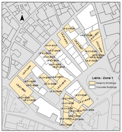 The slope of Zone 1 is completely flat, whereas Zone 2 is inclined from north to south with a minimum slope of 3% and maximum slope of 23%, and an average of 14%. For Zone 3, two portions are separated by the main street, the southern part is flat, and the northern part has a minimum slope of 14% and a maximum slope of 35% with an average of 23% [37]. Only Zone 1 has been analyzed in this work. In Zone 1 there are 39 masonry buildings. For distinction and organization purposes, all buildings were labeled resorting to a unique code (Figure 4).