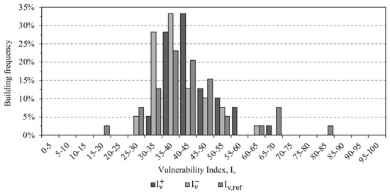 In order to verify that the data followed a normal distribution, the Shapiro–Wilk test was performed on both groups of Vulnerability Index, and . The hypothesis of normality was satisfied, with a value of p-value equal to 0.06 for both cases and therefore higher than α = 0.5, assigned level of significance. The graphical representation of the frequency distribution of the reference vulnerability index Iv,ref (corresponding to the vulnerability classes that were assessed on-site) and the comparison with higher and lower values computed, and , are presented in Figure 6.