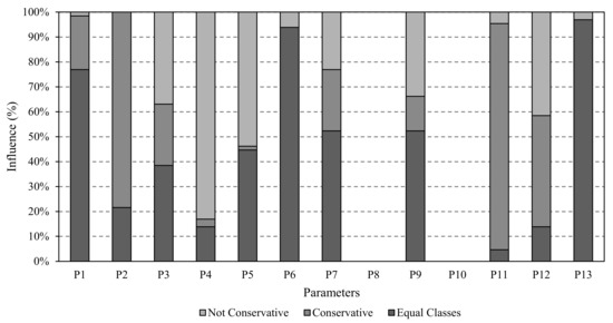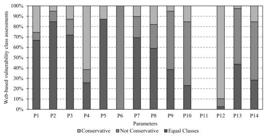 Figure 7 illustrates the divergences found among the parameters that were effectively assessed by means of web-based images when compared to the on-site survey. It shows the proportion of web-based assessments that were conservative, non-conservative, and equal to the assessments performed in-situ. In most cases, the vulnerability classes assigned during the web-based survey correspond to those considered in the reference survey. Attention must be paid to the selection of the vulnerability class for Parameter 6 since this parameter is associated with the soil classification according to relevant National and International seismic design codes. Geological and geotechnical data can be retrieved by documents and data distributed by public administration but can also be estimated by means of the analysis of the topographical slope of the soil surface [38]. This methodology is certainly useful and validated at a large scale, but it can present some limitations in urbanized areas, where a more careful analysis of the built and natural environment must be carried out. In the case of the investigated area, it is worth noting that the area is characterized by a flat soil surface pointing out an alluvial subsoil generated by the floods of the nearby Lis river. Based on this, a “loose soil without impulse and without rock foundation”, Type D according to Eurocode 8 classification [39], was considered, differentiating on this point the work from a preceding one that referred to the same area [37].