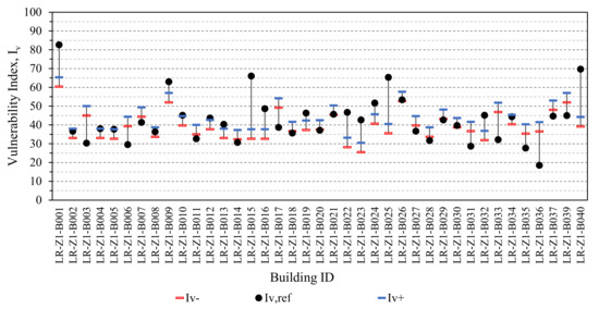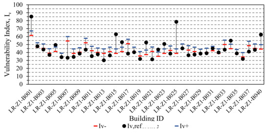 Comparison between the reference vulnerability index and the computed ranges by using remote surveying; the Building ID refers to the keys in Figure 4.