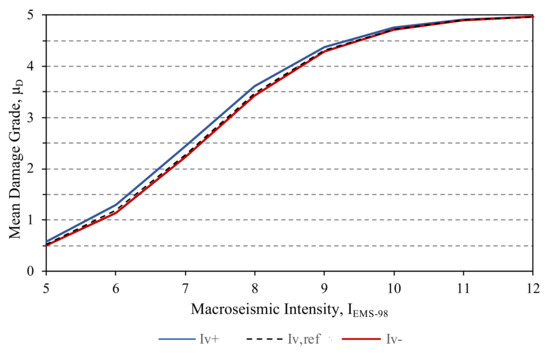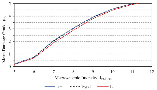 Following the above-presented analytical formulation, it is possible to obtain damage curves for a given IV that represent a certain damage grade µD expected to occur because of a seismic event of a given macroseismic intensity. This damage grade represents a minimum value of 0 that represents no damage at all and a maximum value of 5, representing the total collapse of the structure. Figure 10 presents the construction of the curves for the mean , and Iv,ref found throughout the sample. The reference vulnerability curve fits within the range of the two curves calculated in the previous section.