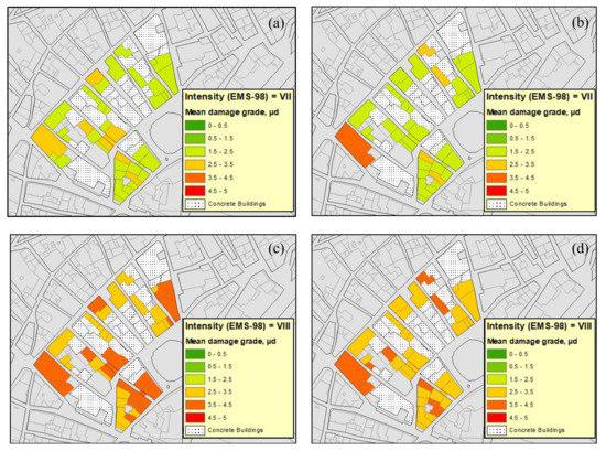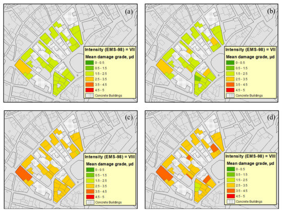 The mean damage grade µD corresponding to the mean of the , values of each building (from now named “central value”) was used in the following analysis. The mean damage grade µD was computed for two classes of macroseismic intensity (VII, VIII), for each building, and both for the central and the reference value of the vulnerability index. The comparison between the results obtained in this work is given through the GIS map of Figure 11. The values of the mean damage grade µD computed were grouped into six classes, corresponding to the damage levels (Figure 12).