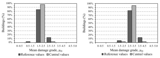 Mean damage grade distributions obtained from both intensities: IEMS-98 = VII (left) and VIII (right) for the façade approach.