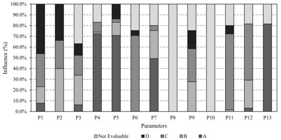 In total, after Ferreira’s calibration, there are 13 parameters that are classified into four main groups to emphasize their relative importance. Such as for the building approach, these parameters are related to four classes, of increasing vulnerability: A, B, C, and D. For each class, a numerical value is assigned and, for each parameter, a weighting factor, pi, reflects its relative importance.