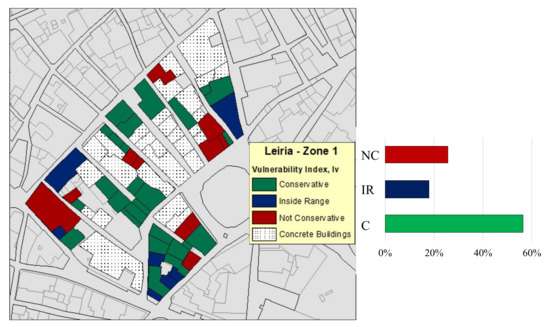 The seismic vulnerability of the old city center of Leiria was evaluated by using the Vulnerability Index Method [28], later adapted and enriched by other authors such as Ferreira [29]. Originally developed in Italy and applied widely over the last 25 years, it was adapted to the Portuguese masonry-built environment by Vicente [29] and Ferreira [30].