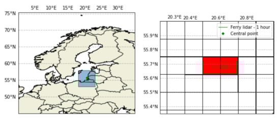 Left: Position of point in Europe. Right: ASCAT grid cell pair and corresponding 1 h of the ferry lidar path on 2 September 2017.