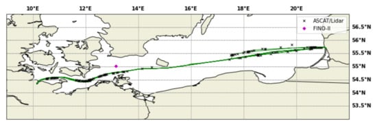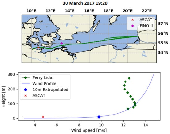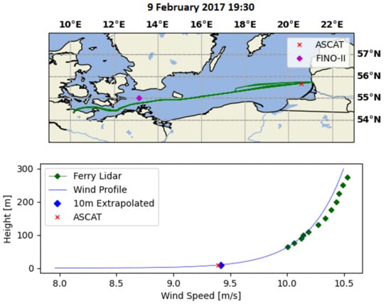 Satellite wind retrievals can provide observations of the ocean surface at improved spatial resolution compared to those of mesoscale models []. Surface-derived winds from scatterometer instruments such as the Advanced Scatterometer (ASCAT) are obtained at a height of 10 m and have been used for offshore wind energy application studies []. While not directly applicable to wind observations needed for wind farm hub height measurements (100+ m), they do provide daily global wind field measurements at the ocean surface. Vertical extrapolation of satellite data has been performed by [,,], bringing surface winds to hub heights using the long-term stability correction from []. These require longer time scales and accurate stability information, whereas vertically extrapolating co-located ASCAT points to the moving instantaneous wind profiles of the ferry lidar adds another level of complexity. However, extrapolating lidar or offshore met masts profiles using surface layer theory down to the 10 m height in order to make a direct comparison with ASCAT is possible. The same process can be performed with the nearby German meteorological mast, FINO2, with a much larger, stationary dataset that can be used as standard for comparison.