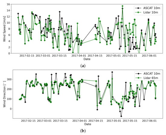 ASCAT-lidar co-location time series data: (a) 10 m wind speed extrapolation; (b) wind directions at different heights.