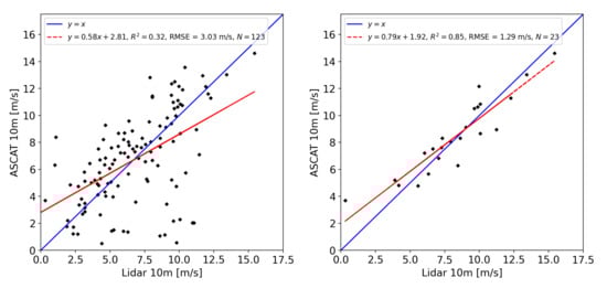 Scatter of extrapolated 10 m ferry lidar wind speed measurements with ASCAT 10 m. (left) All co-located extrapolated values (right) are filtered for near neutral stability (). The blue line is and the red line is the resultant linear regression.