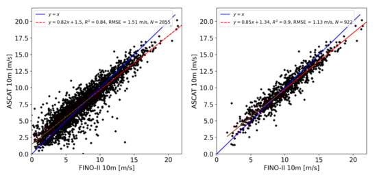 Scatter of extrapolated 10 m FINO2 wind speed measurements with ASCAT 10 m. (left) All co-located extrapolated values (right) filtered for near neutral stabilities (). The blue line is and the red line is the resultant linear regression.
