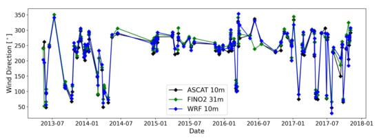 Wind direction comparisons in Table 6 show better results than those for wind speed. ASCAT shows the smallest error, whereas the ferry lidar has a consistently higher source of error at all heights. The WRF–FINO2 comparison has a surprisingly high RMSE above at both available heights on comparison. This is not as evident when looking at the time series of the WRF and ASCAT 10 m height wind directions alongside that of the 31 m FINO2 measurements in Figure 7.