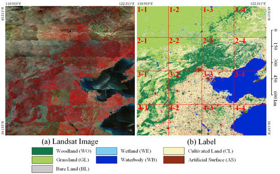 Geographical distribution of Landsat core dataset and Landsat extend dataset in Region N. LSC dataset IDs: 2-2, 2-3, 3-2, 3-3. LSE dataset IDs: 1-1, 1-2, 1-3, 1-4, 2-1, 2-4, 3-1, 3-4, 4-1, 4-2, 4-3, 4-4. (a) Landsat images. (b) Labels.
