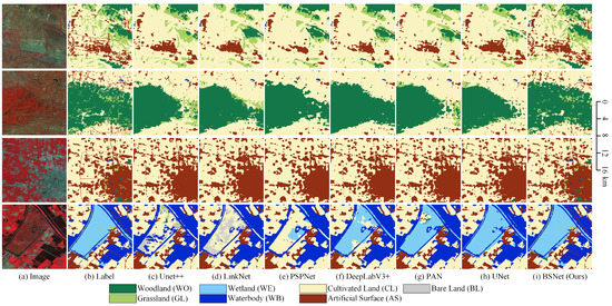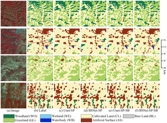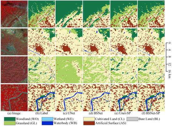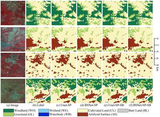 Since there is currently no publicly available large-scale Landsat semantic segmentation dataset, in order to test the performance and generalization ability of our proposed BSNet on large-scale Landsat images, we made two sets of Landsat datasets to test our proposed method. Our research area is located in parts of North China and parts of Southwest China. We downloaded 102 scenes of the 2010 Landsat-5 images and mosaiced the images of the study area, removing the redundant images outside the study area. We finally get 20 tiles of images, each with a size of 10,240 × 10,240 pixels. It covers two study areas. One is an area of approximately 1,440,000 and is between and between . We name it Region N. The other is an area of approximately 360,000 and is between and between . We name it Region SW. We labeled all the images at the pixel level, including seven categories: woodland (WO), grassland (GL), wetland (WE), waterbody (WB), cultivated land (CL), artificial surface (AS), and bare land (BL).
