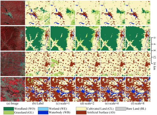 Since UNet belongs to the encoder-decoder style network, it has low memory overhead, fast running speed, and robust scalability. Therefore, we choose UNet as the baseline network. We choose ResNet-50 as the encoder of UNet for feature extraction. ResNet-50 will downsample the feature five times, the output feature map size is 1/32 of the input image, and the position and boundary details of the small target objects will become inaccurate. As shown in Figure 4, there are many small targets at mid-resolution images, such as Landsat images. We could reduce the number of downsampling. However, the features cannot be further aggregated and abstracted, the receptive field of the network cannot be effectively increased. The network cannot learn the necessary global information. We could maintain the ResNet-50 network structure as the original. That means the input data is directly upsampled, turning the small target objects into large target objects for training. It can improve the feature extraction ability of the network for small targets to a certain extent. We assume that our input data size is pixels, the encoder outputs a feature map of pixels after extracting features. At this time, the network has a strong ability to express global information. After upsampling the input data four times, we obtained new data with pixels. The encoder extracts the features and outputs a pixels feature map. At this time, the receptive field of the network is reduced by four times compared with the previous solution, and the global information aggregation degree is not enough. The global information is necessary for some large-range distributed target objects, such as woodland and cultivated land.
