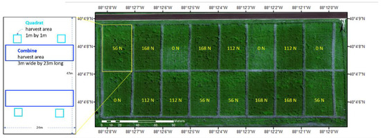 The field study was conducted on Flanagan silt loam (Fine, smectitic, mesic Aquic Argiudolls) at the University of Illinois Energy Farm (40.06869 N, −88.20133 W) in Urbana, IL, USA. The land capability class (LCC) of the site is 4 W-associated low soil fertility and poor drainage. These conditions limit conventional crop production; thus, the land is classified as marginal. A Miscanthus stand was established by planting rhizomes in 2009, which had an annual DM yield of <10 Mg ha−1 with no N application until the current study was initiated in 2018. The current trial was established on a portion of a 10 ha field with dimensions of 100 m (north/south direction) by 200 m (west/east direction) (Figure 1). The individual plots (47 m × 24 m) were arranged in a randomized complete block design with (RCBD) replicated four times. The treatments were four N application rates of 0, 56, 112, and 168 kg N ha−1 (hereafter referred to as 0 N, 56 N, 112 N, and 168 N, respectively) using urea as the N source. Fertilizer was applied in late April in both 2018 and 2019. Four quadrats (1 m × 1 m) were randomly placed in each plot (64 quadrats in total), immediately after fertilizer application.