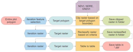 The spatial distribution of crop stand health can be visually determined from VI maps. However, interpretation in the study was challenging due to the high resolution and variation within the harvested areas. Thus, to assess changes in Miscanthus coverage and, subsequently, stand health, the vegetation indices (ranging from −1 to 1) were reclassified into bare land (BL), unhealthy (UH), moderately healthy (MH) and very healthy (VH) using the model builder in ArcGIS (Table 2). The process involved three steps (Figure 2). First, the entire polygon map was broken down into individual polygons, and VIs were clipped from them. Here, a polygon is a quadrat or machinery harvest area (see Section 2.4). A total of 384 raster maps were generated form the quadrat-area polygons (64 quadrat areas × 3 UAV flights × 2 years), and 192 were obtained from the machinery harvest area (32 machinery harvest area × 3 UAV flights × 2 years). The second step involved the reclassification of the raster value into the four levels by utilizing the iteration raster function in the model builder to read the individual raster files. Finally, the reclassified VIs were expressed as cell counts for each level, and the percent of coverage for each plant level was calculated within each quadrat and machinery-harvest area.
