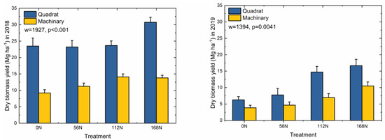 Average 2018 DM and FM yields were approximately twice those of 2019 (Figure 3). Significant differences in FM and DM yield due to N application were detected (Table 4 and Table 5). Biomass yields were greater in 168 N compared to 0 N. However, no differences were observed between 0 N and 56 N nor 112 N and 168 N. Both FM and DM yields harvested from the quadrats were higher than those from the machine-harvested areas in 2018 (both p < 0.001) and 2019 (p = 0.004 and p < 0.001, respectively) (Table 5).