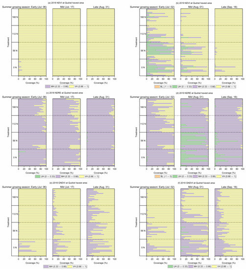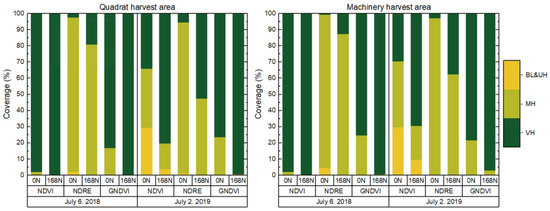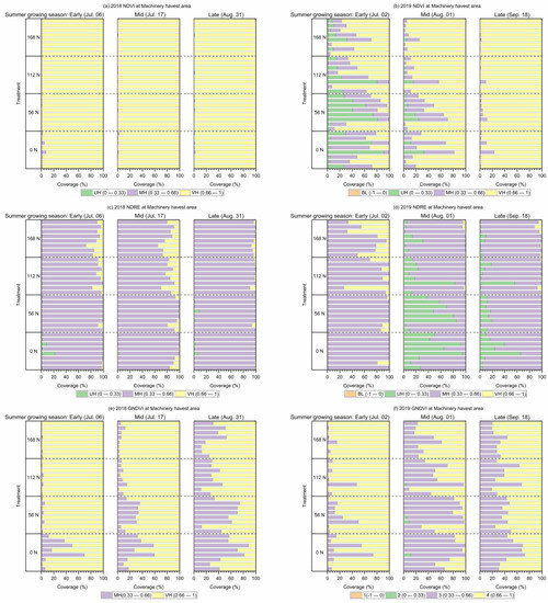 Unlike NDVI, the NDRE results show the MH stand condition dominated (Figure 4 and Figure 5). In 2018, early July NDRE showed that about 25% of quadrat- and 22% of machine-harvested areas were UH in the 0 N treatment (Figure 6). Despite not being visible in the mid-summer growing season (mid-July), UH occurred again in 0 N (quadrat-harvested area, 5%; machine-harvested areas, 6%) and 56 N (quadrat-harvested areas, 3%; and machine-harvested area, 6%) treatments in the late-summer growing season (late August). In 2019, early July showed a high proportion of VH in the 112 N and 168 N treatments compared to the 0 N and 56 N treatments. Moreover, the mid-summer growing season (August) measurements showed a sharp increase in UH stand in the low-N treatments. For example, 42% of quadrat- and 51% of machine-harvested areas were UH in the 0 N treatment but reduced to 4% and 8%, respectively in the 168 N treatment. Late-growing-season (mid-September) NDRE had an increase in MH across all N treatments regardless of harvest area (Figure 6).