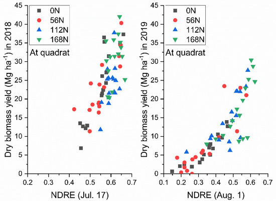 Nevertheless, the regression between VIs and biomass yields shows that mid-summer-growing-season (mid-July to August) measurements of NDRE provide a more consistent prediction of FM and DM yield of Miscanthus (ranged from 0.86 R2 to 0.97 R2). Studies have found that VIs reflecting peak greenness, collected from late June to early August, are most effective in forecasting crop yield [48,49,50]. Coefficient-of-determination values show that generally, mid-July to early August provides the best forecast of Miscanthus FM and DM. These results contrast with those reported by Li et al. [28] and Li et al. [51], who found that NDRE alone produced poorer forecasts of both switchgrass and sorghum yield relative to other indices, including NDVI. However, both studies used UAV images obtained late in the growing season (August to November), and the authors ultimately concluded that including other phenotypic traits in the regressions might improve their performance. Since Miscanthus usually achieves maximum growth in central Illinois in September [38], our findings suggest that NDRE is sensitive to differences in plant vigor due to N treatment during periods of peak Miscanthus growth (Figure 7). These findings also highlight the importance of mid-July to early August phenotypic measurements as indicators of potential DM yields of Miscanthus.