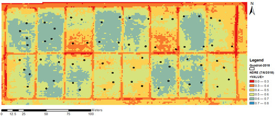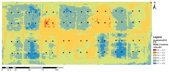 Aggregated NDRE maps during the early-summer growing season (6 July 2018 and 2 July 2019) with 1 m × 1 m resolution and quadrat locations in 2018 and 2019.