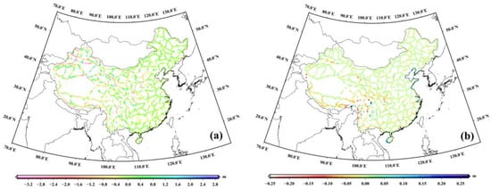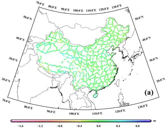 Table 3 shows the quasi-geoid accuracy statistics of different GFMs in China. From Table 3, without considering the influence of the RTM on the quasi-geoid height, the quasi-geoid accuracies of the refined GFMs in mainland China are better than 18.5 cm. Among them, the DIR_R6_EGM2008 model has the best accuracy, at 18.1 cm. Compared with the EGM2008 model, the quasi-geoid accuracy of the DIR_R6_EGM2008 model is improved by 8.8 cm. On the other hand, these results also indicate that the quasi-geoid medium-long wavelength accuracy of EGM2008 model in China is poor. Considering the influence of the RTM quasi-geoid, the mainland China quasi-geoid accuracies determined by the refined GFMs are better than 17.8 cm, and the DIR_R6_EGM2008_RTM model has the optimal quasi-geoid accuracy with a standard deviation of 17.3 cm. Compared with the EGM2008 model, the quasi-geoid accuracy of the DIR_R6_EGM2008_RTM model is improved by 9.6 cm. Compared with the TIM_R5, TIM_R6, DIR_R5, and DIR_R6 models, the quasi-geoid accuracy of the DIR_R6_EGM2008_RTM model is improved by 0.400 m, 0.391 m, 0.396 m, and 0.391 m to 0.178 m, 0.177 m, 0.176 m, and 0.173 m, respectively.