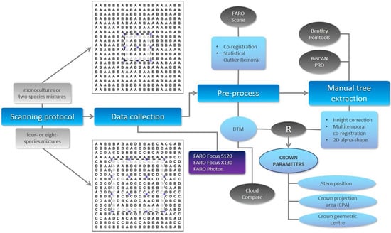 Workflow of data preparation. Schematic representation of the scanning protocol is adapted from Kunz et al. (2019, Figure S1) []. There, blue asterisks represent scanning positions, and letters indicate different tree species. Black circles show the used software, while the outcomes are in light blue circles. Main processes are in blue squares and the instruments used are in a purple square.