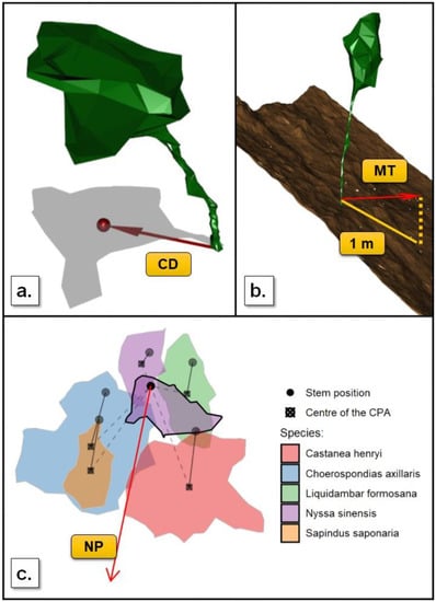 For each target tree, we calculated an index of neighbourhood pressure (NP, Equation (1)). Other studies assume a linear relation between the size of the tree and its pressure on the target tree [,,,,]. In this study, we, therefore, developed a new parameter that scale the pressure depending on the relative canopy position in respect of the target tree: the canopy level index (cli, Sup. Equation (1)). To account for the crown size of the neighbour and the direction of growth, we also include the CD of the neighbour.
