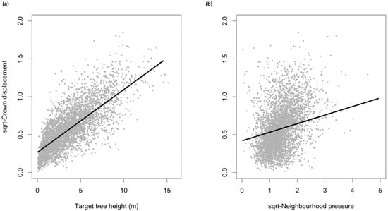 Differences in the strength of the effects of (a) target tree height and (b) neighbourhood pressure (square root-transformed) on crown displacement (square root-transformed). Lines represent mixed-effects model fits with microtopography and neighbourhood tree species richness kept at their means. Grey points represent observed values.