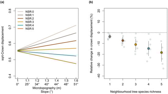 (a) Effects of microtopography (MT) on crown displacement (square root-transformed) with varying levels of neighbourhood tree species richness (NSR). Lines represent mixed-effects model fits (with target tree height and neighbourhood pressure kept at its mean). X-axis shows MT in meters and its conversion to slope in degrees. (b) Relative changes (%) in crown displacement between conspecific neighbourhoods (NSR: 0) and heterospecific neighbourhoods (NSR: 1–5). Dots represent predicted means based on a mixed-effects model (with target tree height kept at its mean), and error bars indicate the 95% confidence interval of the prediction. Grey points (slightly jittered to facilitate visibility) represent predictions for each level of the microtopography gradient ranging from 1 to 1.6 (see panel (a)).