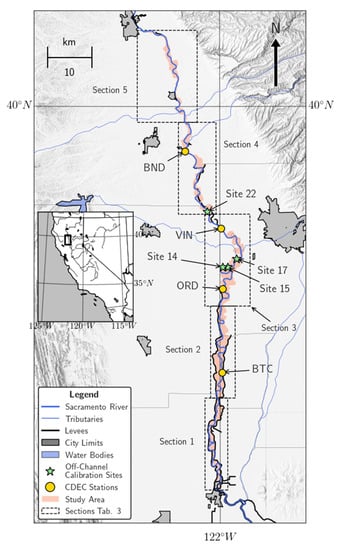 Off-channel habitats, particularly in highly modified rivers, are crucial to the development, survival, and long-term persistence of Sacramento River Pacific salmon (e.g., [,,,]). However, there is a paucity of information on quantitative descriptions of the existing extent and quality of shallow-water habitats, which can hinder their explicit consideration in proposed restoration or recovery actions, particularly for winter-run Chinook salmon [,,]. Sparse efforts, mostly as part of larger spatial coverages, have reported general information such as off-channel area per river km or total extent (e.g., Pacific Rim) [,]. Nevertheless, these estimates, and the omission of the dynamic behavior of seasonal shallow habitat, which are key in their ecological value [,,], might have generated little value to specific restoration efforts.