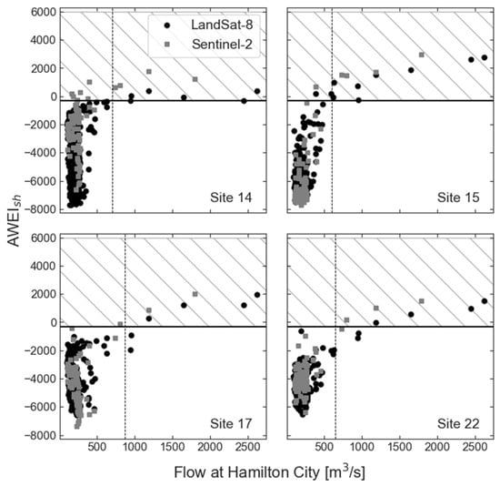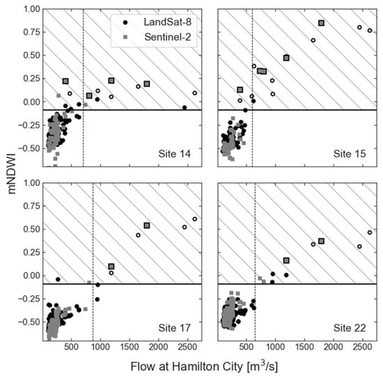 Computed mNDWI values at the four off-channel sites listed in Table 3 show a clear differentiation between dry and wet conditions for both LandSat-8 and Sentinel-2 products, especially at site 17, which required the highest flows to become active []. During dry conditions at the OCWBs, mainstem flows were well under activation thresholds (e.g., <200 m3/s), mNDWI values were consistently under −0.2, much less than the theoretical 0 threshold. Under wet conditions, when threshold flows were exceeded, values over −0.05 were extracted from the remote sensing image collection. Greater mNDWI values were obtained for increasing flows (Figure 2), from more prominent and deeper inundated areas, closer in spectral behavior to the mainstem (mNDWI > 0.4). Thus, the range from −0.2 to −0.06 was analyzed in more detail to establish an approximate threshold. Site 14 exhibited the most mNDWI values in this range, with several observations between −0.10 to −0.16 during May 2017 (LandSat-8) and June–August 2019 (LandSat-8 and Sentinel-2), when higher flows occurred (400–600 m3/s), but several weeks after high-flow storm events (>14 days). Additionally, several values were in the −0.2 to −0.15 range for low flows (<300 m3/s). An analysis of the images during these dates showed the site disconnected from the mainstem. As such, a final threshold for mNDWI of −0.08/−0.07, for LandSat-8 and Sentinel-2 products, respectively, was defined. Nevertheless, sites 14, 15, and 17 presented wetted conditions for flows under the required threshold (vertical dashed line in Figure 2). The analysis of the images represented by each data point (e.g., 17 March 2017 and 19 February 2019) showed that the off-channel areas were effectively inundated, from high flows occurring 4–11 days before the satellite overpass, and hence, were continuously activated during receding flows.