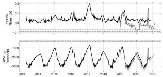 Computed mNDWI and AWEIsh threshold values using Otsu’s binarization algorithm. Black line represents LandSat-8 products while gray line represents Sentinel-2 products. Dashed lines indicate defined single thresholds.