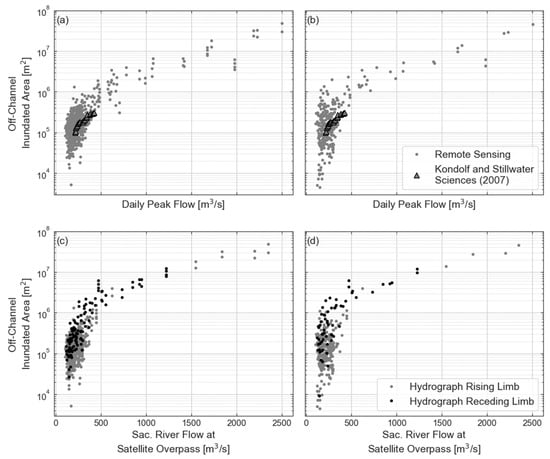 OCWBs’ extent during the receding limb of the hydrograph were consistently higher than those from the rising limb for the same mainstem flows (~35%), visually identifiable when off-channel area estimates are plotted against Sacramento River daily flow at the date of satellite overpass (Figure 5c,d). They present a loop-like pattern, with two possible inundation extents depending on the timing of the image in respect to the high-flow event hydrograph. The difference is especially well-represented by the quantified off-channel areas for 1980 m3/s (4th highest peak flow in available images), which seemed to be underestimated when compared with the trend of the remaining high-flow data points (Figure 5a,b). However, source image was recorded 5 days after peak flows (14 February 2019 and 19 February 2019, respectively), during flow recession when mainstem flows were 472 m3/s (24% of the peak). Computed inundation was one order of magnitude greater than other events with mainstem flows of ~450 m3/s during the rising limb of the hydrograph (Figure 5c,d).