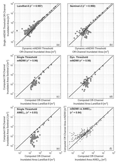 Comparison of computed inundated areas using the different considered procedures: (a) dynamic mNDWI threshold versus single mNDWI threshold for LandSat-8; (b) Dynamic mNDWI threshold versus single mNDWI threshold using Sentinel-2; (c) mNDWI single threshold using LanSat-8 versus using Sentinel-2; (d) mNDWI dynamic threshold using LandSat-8 versus using Sentinel-2; (e) AWEIsh using LandSat-8 versus Sentinel-2, and (f) mNDWI (single and dynamic thresholds) vs. AWEIsh estimates using both LandSat-8 and Sentinel-2 products.