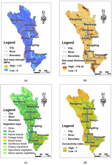 The data used for the susceptibility prediction: (a) the soil mass strength, (b) soil mass thickness, (c) vegetation types, (d) channel connectivity, (e) flow depth, and (f) runoff velocity.