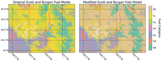 The original (left) and modified (right) Scott and Burgan fuel model layers used in the WRF-Fire simulations. The active fire perimeter used to initiate the simulations is shown in white. Fuel categories represent the fuel type of the fuel model; slash–blowdown (SB), timber litter (TL), timber–understory (TU), shrub (SH), grass–shrub (GS), grass (GR), and nonburnable (NB).