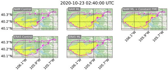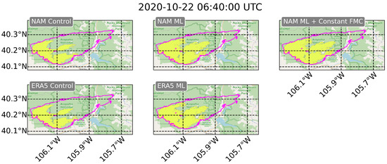 The sensitivity simulation results (solid yellow) using NAM meteorological data with the original fuel inputs, the modified fuel inputs, and the modified fuel inputs with a constant 8% fuel moisture content (labeled NAM Control, NAM ML, and NAM ML + Constant FMC, respectively), and the simulations using ERA5 with the original fuel inputs and the modified fuel inputs (labeled ERA5 Control and ERA5 ML, respectively). The observed fire perimeter (solid magenta line) was captured aerially at 06:40 UTC on 22 October 2020.