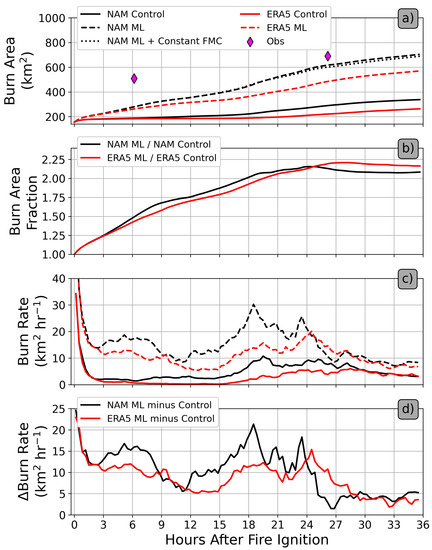 Time series of (a) burn area (km2), (b) burn area fraction (ratio of ML to Control), (c) burn rate (km2 h), and (d) burn rate difference (ML minus Control). Model results are shown by the lines (according to the legend), while NIFC IR perimeters are shown in the magenta diamonds (labeled ‘Obs’ in the legend). The legend for panel (a) also applies to panel (c).