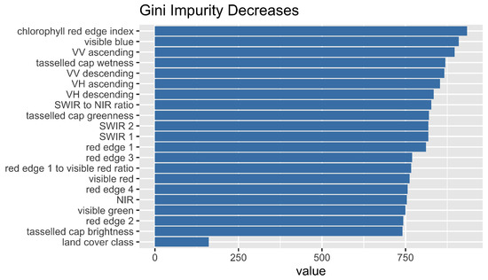 The development and implementation of the RF in this study was performed in Google Earth Engine, which gives the Gini impurity decreases of each random forest node as a metric of feature importance. Examining the hierarchy of these values for the RF features shows that the chlorophyll red-edge index suggested by Meddens, Hicke, Vierling, and Hudak [20] is the most important feature (Figure 8). This index is particularly sensitive to chlorophyll, carotenoids, and anthocyanin production [34], which indicate vegetation senescence. There is an inevitable change in senescence simply due to the seasonal changes between July 2019 (the time of the tree mortality surveys) and September 2020 (the time just before the East Troublesome Fire). As the chlorophyll red-edge index is important to classification, senescence may be confounded with the intended classification of tree mortality in this case. However, the C-SAR bands, which contribute information on the surface texture and were intended to help distinguish between vegetation types and standing and downed timber, were also highly important to the classification. Given the high degree of classification accuracy, this indicates that collectively the input data provided was adequate to train the RF, and that any cells classified as tree mortality due to the signature of senescence are of minimal consequence.
