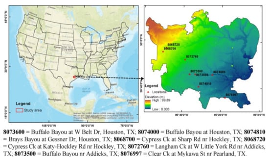 Throughout the greater Houston area, the daily precipitation intensity varied from 10 mm/day to greater than 100 mm/day from 25–29 August 2017. Hurricane Harvey precipitation led to maximum flooding on 27 August []. The precipitation associated with Hurricane Harvey started on 25 August, peaked on 28 August, and persisted until 30 August 2017, causing extensive flooding []. This study is focused on the period from 29 August through 2 September and 5 September 2017. The LiDAR DEM data were obtained from the Texas Natural Resources Information System (TNRIS, https://tnris.org/data-download/#!/statewide accessed on 1 November 2017) at a spatial resolution of 1 m.