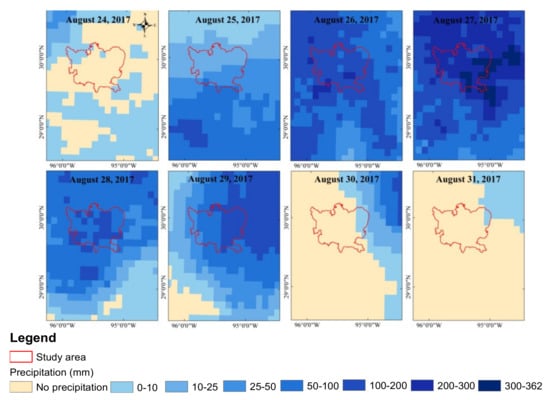 The study site is the greater Houston area, a densely populated urban–rural region with an area of about 4692 km2 (Figure 1). The study time period is focused on flooding during and after the passing of Hurricane Harvey from 29 August to 5 September 2017. The spatial and temporal variability of daily precipitation from Global Precipitation Measurements (GPM) from August 24 to 31 is illustrated in Figure 2 (https://pmm.nasa.gov/data-access/downloads/gpm accessed on 1 October 2017).